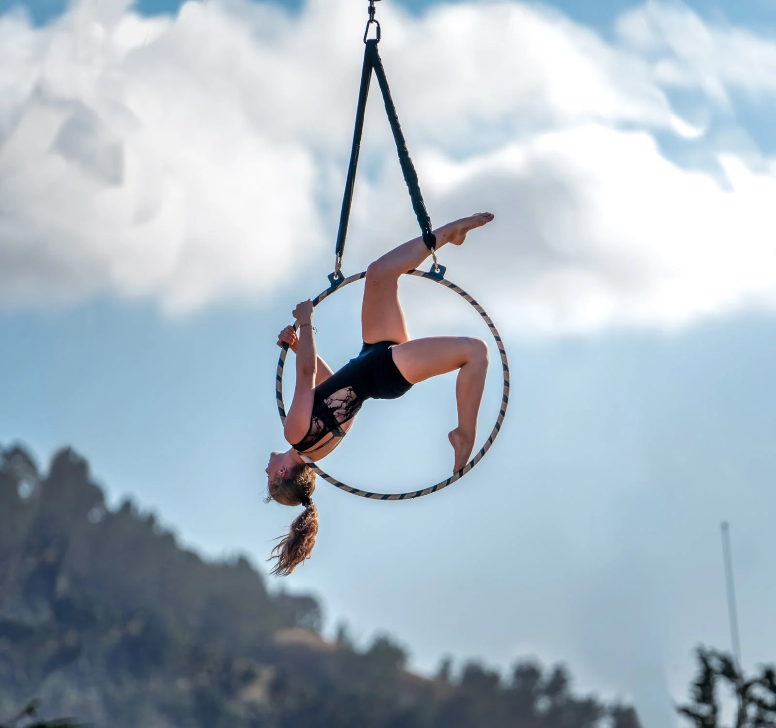 For those new to Lyra, you'll focus on building foundational skills like strength, flexibility, and basic techniques such as inversions, rolls, and spins. Classes begin with a warm-up to prepare your body for the apparatus.