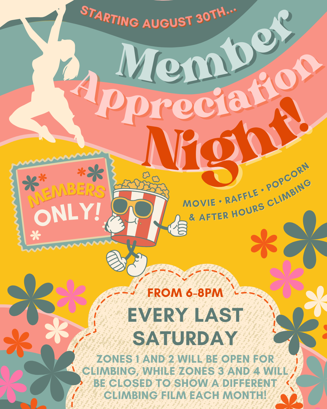 STarting August 30, The last saturday OF every month, we’ll stay open 2 hours later for members only- one side of the gym will be available to climb, while the other side will have a movie playing! popcorn included!